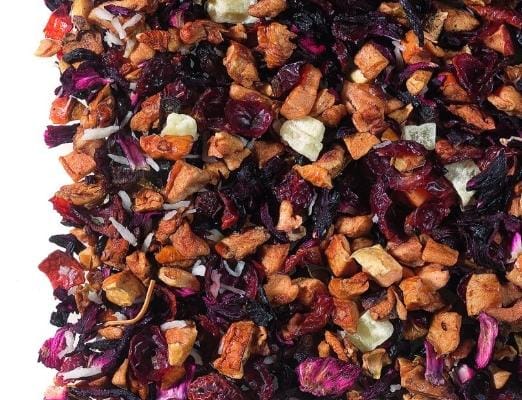 Ananász, kókuszdarabok, csipkehéj, hibiszkusz és alma együttese.
